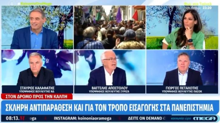 O Βαγγέλης Αποστόλου, Βουλευτής ΣΥΡΙΖΑ ΠΣ Ευβοίας και πρώην Υπουργός, στην εκπομπή «Κοινωνία ώρα MEGA» και τους δημοσιογράφους Ανθή Βούλγαρη και Ιορδάνη Χασαπόπουλο.