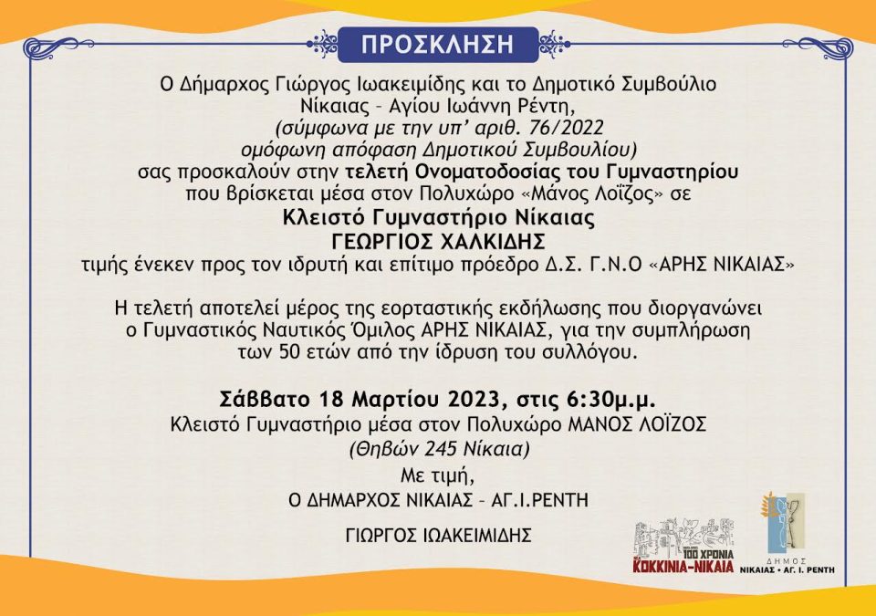 Σε Κλειστό Γυμναστήριο Νίκαιας ΓΕΩΡΓΙΟΣ ΧΑΛΚΙΔΗΣ θα ονομαστεί το γυμναστήριο που βρίσκεται μέσα στον Πολυχώρο «Μάνος Λοϊζος» (Θηβών 245), τιμής ένεκεν προς τον ιδρυτή και επίτιμο πρόεδρο Δ.Σ. Γ.Ν.Ο «ΑΡΗΣ ΝΙΚΑΙΑ», μετά από ομόφωνη απόφαση Δημοτικού Συμβουλίου Νίκαιας-Αγ.Ι.Ρέντη. Η τελετή Ονοματοδοσίας θα πραγματοποιηθεί το Σάββατο 18 Μαρτίου στις 6.30 μ.μ στο πλαίσιο της εορταστικής εκδήλωσης που διοργανώνει ο Γυμναστικός Ναυτικός Όμιλος ΑΡΗΣ ΝΙΚΑΙΑΣ, για την συμπλήρωση των 50 ετών από την ίδρυση του συλλόγου