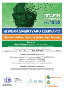 Το Τμήμα Κοινωνικής Προστασίας, Παιδείας και Εθελοντισμού του Δήμου Λυκόβρυσης Πεύκης και ο Όμιλος ΑΚΤΙΟΣ σας προσκαλεί στο δωρεάν Διαδικτυακό Σεμινάριο για τις θεραπευτικές προσεγγίσεις της άνοιας, που θα πραγματοποιηθεί την Τετάρτη 16 Μαρτίου 2022 στις 18:00. Εισηγητής ο Κωστής Προύσκας Ψυχολόγος και Διδάκτωρ Γεροντολογίας, Διευθύνων Σύμβουλος Ομίλου ΑΚΤΙΟΣ, Κλινικός Διευθυντής Blocks Group.
