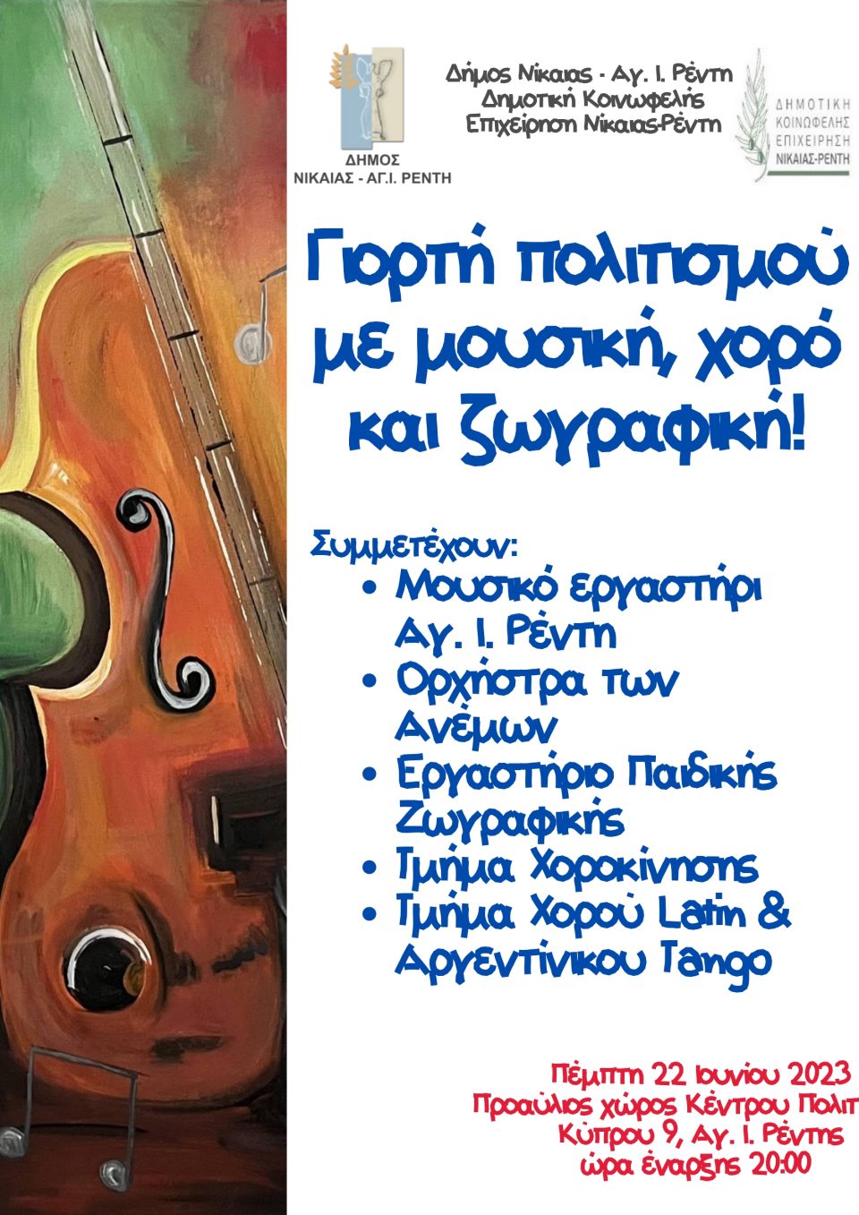 Έκθεση ζωγραφικών έργων, χοροκίνηση, χοροί λάτιν, μουσικά σύνολα και ροκ συναυλία από τους μαθητευόμενους στα τμήματα της Δημοτικής Κοινωφελούς Επιχείρησης Νίκαιας-Ρέντη (ΔΗ.Κ.Ε.ΝΙ.Ρ) περιλαμβάνονται στην εκδήλωση που θα πραγματοποιηθεί την Πέμπτη 22 Ιουνίου 2023 στις 8 το απόγευμα στο προαύλιο του Κέντρου Πολιτισμού του Δήμου Νίκαιας-Αγ.Ι.Ρέντη (Κύπρου 9, Αγ.Ι. Ρέντης) με ελεύθερη είσοδο για το κοινό.