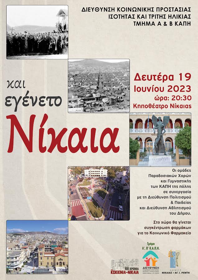 Στο πλαίσιο εορτασμού των 100 χρόνων από την ίδρυση της πόλης (18/6/2023) ,θα πραγματοποιηθεί η εκδήλωση «και εγένετο Νίκαια» τη Δευτέρα 19 Ιουνίου στο Δημοτικό Κηποθέατρο (Κύπρου και Προύσσης) στις 8.30 μ.μ. Παράλληλα η εκδήλωση είναι αφιερωμένη και στην ονοματοδοσία της πόλης που έγινε στις 18/9/1940 και μετονομάστηκε από Νέα Κοκκινιά σε Νίκαια .