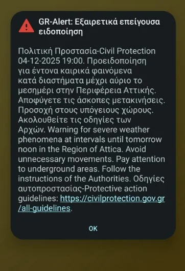 Στο μήνυμα η Πολιτική Προστασία προειδοποιεί για έντονα φαινόμενα ως το μεσημέρι της Παρασκευής και προτρέπει τους πολίτες να αποφύγουν τις άσκοπες μετακινήσεις και να είναι ιδιαίτερα προσεκτικοί στους υπόγειους χώρους.