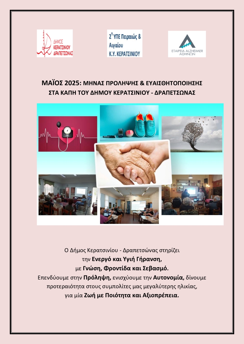 Το Τμήμα Προστασίας Τρίτης Ηλικίας του Δήμου Κερατσινίου – Δραπετσώνας, με σταθερή δέσμευση στην προαγωγή της υγείας και της ποιότητας ζωής των συμπολιτών μας μεγαλύτερης ηλικίας, και συμπράττοντας με εξειδικευμένους φορείς και επιστημονικούς συνεργάτες, υλοποιεί κατά τον μήνα ΜΑΪΟ μία σειρά σημαντικών προληπτικών δράσεων ενδυνάμωσης και υποστήριξής τους.