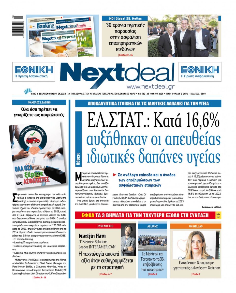 Με πρώτο θέμα τις ιδιωτικές δαπάνες υγείας στη χώρα, ένα μεγάλο αφιέρωμα στο leasing και τρία ένθετα το NextDeal health, το Bancassurance & Banking και το NextDeal Cyprus κυκλοφορεί σήμερα στα περίπτερα όλης της χώρας η εφημερίδα NextDeal.