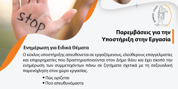 Ο Δήμος Ιλίου, στο πλαίσιο των δράσεων του Δικτύου Κοινωνικής Καινοτομίας, διοργανώνει νέο κύκλο παρεμβάσεων για την υποστήριξη στην Εργασία. Ο νέος κύκλος αφορά την ενημέρωση σε ζητήματα σχετικά με τη σεξουαλική παρενόχληση στον χώρο εργασίας και απευθύνεται σε εργαζόμενους, ελεύθερους επαγγελματίες και επιχειρηματίες που δραστηριοποιούνται στην πόλη του Ιλίου.