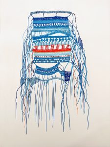 Στην καλλιτεχνική μου δραστηριότητα, αυτό το μονοπάτι που βαδίζουμε, η νοητή γραμμή που χαράζουμε, μου έρχεται ως εικόνα μιας εύκαμπτης κλωστής, όπως οι κλωστές της ελληνικής μυθολογίας με τις οποίες μεγάλωσα. Το νήμα της Αριάδνης που οδηγεί στο Λαβύρινθο και έξω απ’ αυτόν. Η Πηνελόπη που πλέκει ευλαβικά κατά τη διάρκεια της ημέρας και τη νύχτα ξηλώνει τη δουλειά της για να κρατήσει μακριά τους μνηστήρες της, καθώς περιμένει υπομονετικά τον Οδυσσέα να επιστρέψει στο σπίτι. Η ταλαντούχα Αράχνη, της οποίας η σχολαστική δουλειά φούντωσε τη ζήλια της Αθηνάς. Αυτές οι ιστορίες είναι απόλυτα συνυφασμένες με την – εν μέρει – ελληνική κουλτούρα μου και πιάνω τον εαυτό μου να τις σκέφτεται συχνά. Και έπειτα υπάρχουν και οι καθημερινές κλωστές, αυτές που είδα να τυλίγονται τόσες φορές στα δάχτυλα της λατρεμένης μου γιαγιάς».