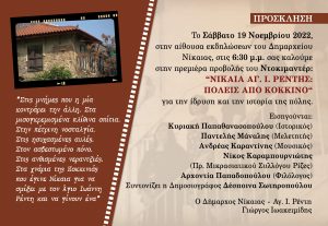 Η πρεμιέρα προβολής του ντοκιμαντέρ «Νίκαια-Αγ.Ι. Ρέντης, πόλεις από κόκκινο» για την ίδρυση και την ιστορία της πόλης θα πραγματοποιηθεί το Σάββατο 19 Νοεμβρίου στις 6.30 μ.μ. στην αίθουσα εκδηλώσεων του Δημαρχείου Νίκαιας (Π. Τσαλδάρη 10). Στην εκδήλωση θα μιλήσουν οι : Κυριακή Παπαθανασοπούλου (Ιστορικός), Παντελής Μάναλης(Μελετητής), Ανδρέας Καραντίνης (Μουσικός), Νίκος Καραμπουρνιώτης (Πρόεδρος Μικρασιατικού Συλλόγου «Ρίζες»), Αρχοντία Παπαδοπούλου(Φιλόλογος). Συντονίζει η δημοσιογράφος Δέσποινα Σωτηροπούλου.