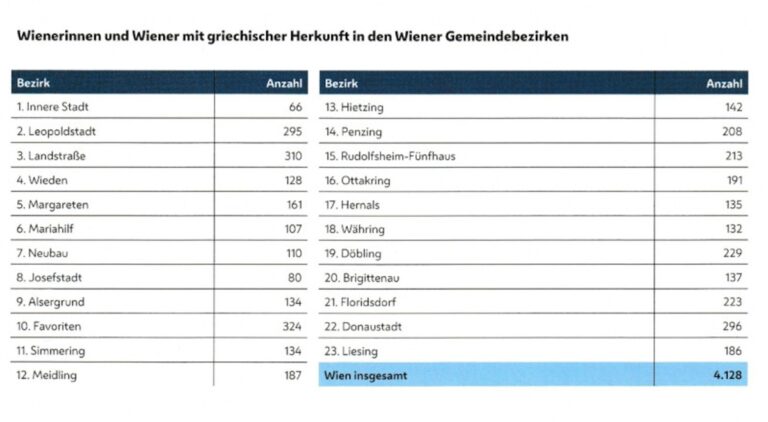 Η απάντηση δόθηκε σε μία συνάντηση που είχαν μέλη του Συλλόγου “Ήφαιστος Βιέννης” με στελέχη του Δήμου κατά την οποία τους δόθηκαν τα επίσημα στοιχεία για όσους Έλληνες κατοικούν στη Βιέννη: 4128 είναι οι Έλληνες κάτοικοι της Βιέννης (53% Άρρεν, (2180) και 47% Θήλυ, (1948)).